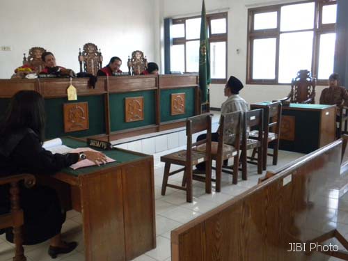 Hakim Ketua, Komarudin Simanjuntak SH didampingi hakim anggota, Sahat P Sihombing SH dan Roro Dwi Handayani SH bertubi-tubi melontarkan pertanyaan kepada pria yang menjadi saksi dalam sidang perdana yang menyeret Ningsih ke Pengadilan Negeri (PN) Sragen, Selasa (17/1/2012) siang. Bapak yang memakai peci itu tidak lain ayah kandung Ningsih, yakni Waluyo, 48, warga Cibajak RT 007, Desa Canggal, Kecamatan Candiroto, Kabupaten Temanggung.