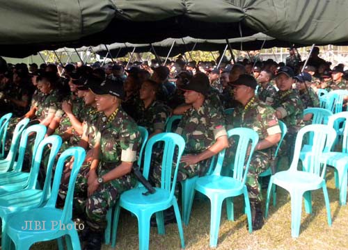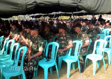 SRAGEN—Sebanyak 650 orang prajurit TNI yang tergabung dalam satuan tugas pengamanan perbatasan (Satgas Pamtas) Yonif 408/Suhbrastha Sragen berpamitan dengan keluarga dan para pimpinan instansi anggota Forum Pimpinan Daerah (Forpimda) Sragen, Rabu (11/7/2012). Mereka berangkat ke daerah perbatasan Indonesia-Papuna Nugini dengan menggunakan kapal dari Pelabuhan Tanjungmas Semarang, Jumat (13/7) besok.